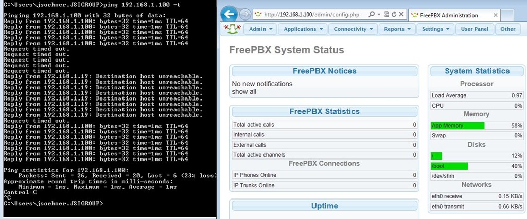 Now if one of my vm hosts goes offline (loss of power, network, etc.) then my PBX is dynamically moved to a new host and brought online again with a short downtime (about 15 seconds) shown below.