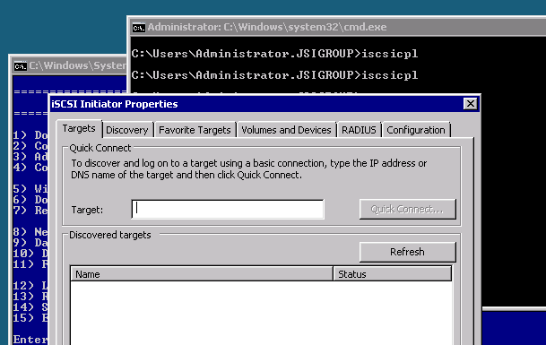 Next we are going to use iscsicpl (the control panel added to R2) in order to add our iSCSI target volumes to our first hyper-v cluster server. When we type this command into the hyper-v machine we are asked if we want the Microsoft iSCSI service to start automatically so please say yes.