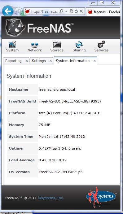 I had run Windows 2003 on this but I found that the OS overhead coupled with the poor NFS/iSCSI support forced my to run it with Linux/BSD variant instead. I know that Open Filer would run on a small partition on the hardware RAID controller I had but the Adaptec 2100 was not supported in the 32 bit version of OpenFiler 2.3. (I have used it for clients with an HP rack mount server without problems and it runs surprisingly stable too). I choose to grab the new version of FreeNAS that uses the FreeBSD kernel and it would prove a surprise to be able to run with all my old hardware. The only caveat is that I could not run it on a USB/Compact Flash drive and had to settle for an old IDE hard drive to run the OS. ![]()