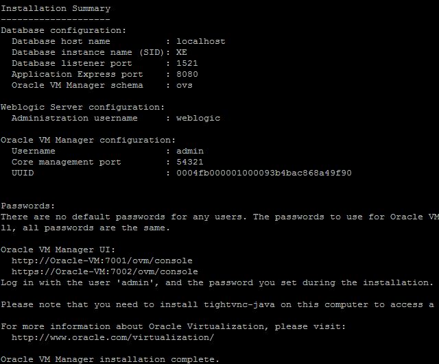 After entering three passwords for the database, weblogic and VM manager applications the install ran for about 20 minutes (your time may vary). We are then presented with a line that tells us to wait while ‘ WebLogic configures the applications…”