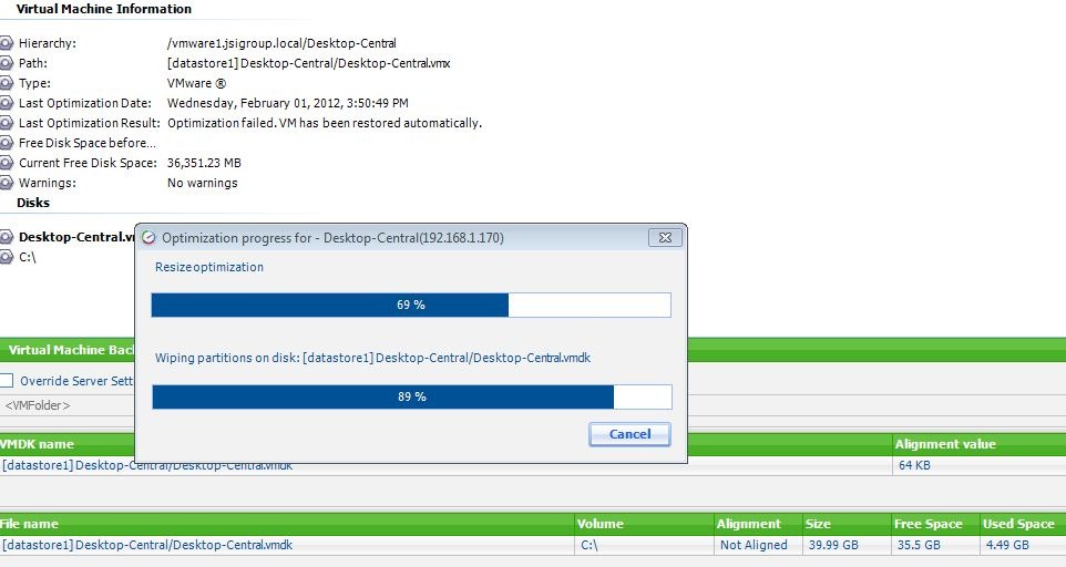 We started by connecting to a Windows 2003 VM on our ESXi 5 server that was grossly oversized at 40G. This project was setup to remove every excess file (including removing the swap file) and once we had successfully ran the disk optimizer we were left with a running server that was only about 11G in size. The entire process only took about 40 minutes of downtime.