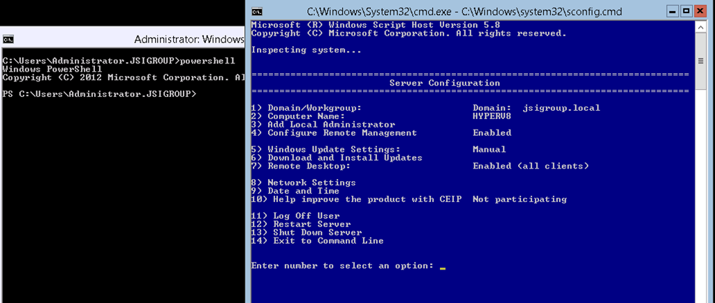 on the console to enable remote management from a Windows 2012 server. (The server manager won’t connect to Windows 2012 from Windows 7 – I think you must be using Windows 8). I then typed powershell to begin a shell on the hyperv box. ![]()