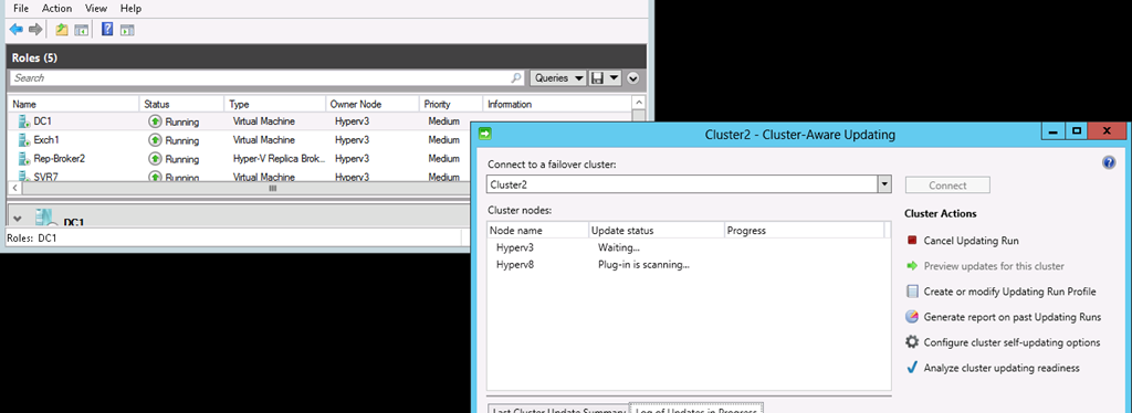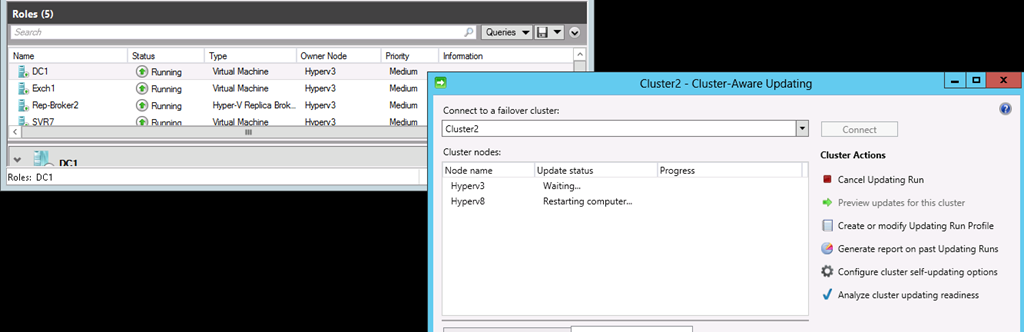 Enter Cluster aware updating – this new feature of Hyper-V allows any small to medium enterprise (SME) to implement two Hyper-V servers with enough memory to run all of the virtual servers they need to operate their business (Exchange, SharePoint, File server, SQL, etc.) Most systems come with redundant hardware (power supplies, hard drives, etc.) so a single point of failure is all but eliminated but what about updates and maintenance? If you want to keep everything running or even just want to test your recover options in the event of failure you need to fail over your live system with as little or no downtime right?